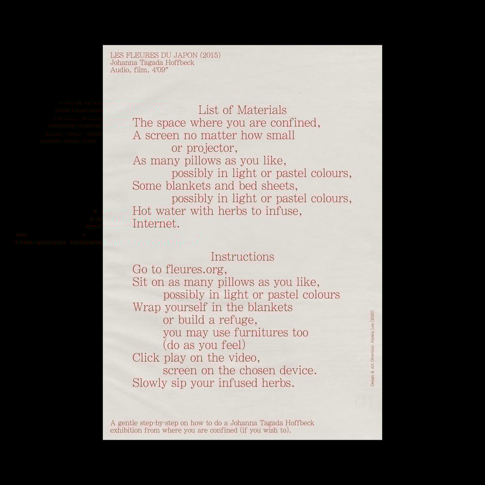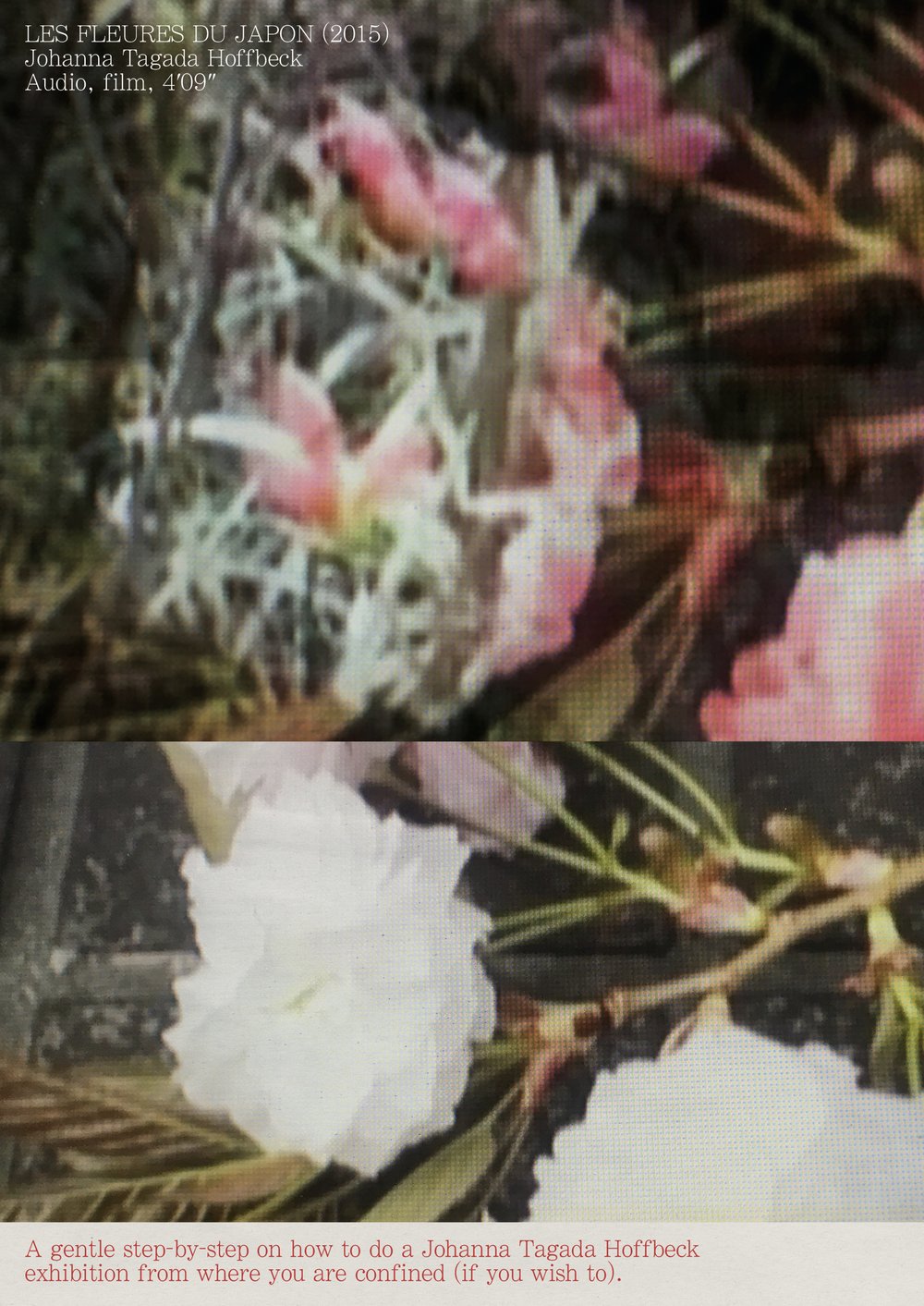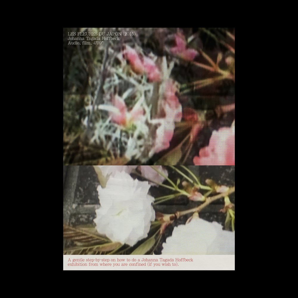 A gentle step-by-step on how to do a Johanna Tagada Hoffbeck exhibition from where you are confined (if you wish to). An initiative conceptualised by Johanna Tagada Hoffbeck, produced and developed in collaboration with designer Alyssia Lou in Spring 2020, while both women found themselves confined in France in relation to the Covid-19 pandemic. More information via fleures.org. The present edition of one hundred posters is a physical souvenir to this digital art project. All artworks and images by Johanna Tagada Hoffbeck.